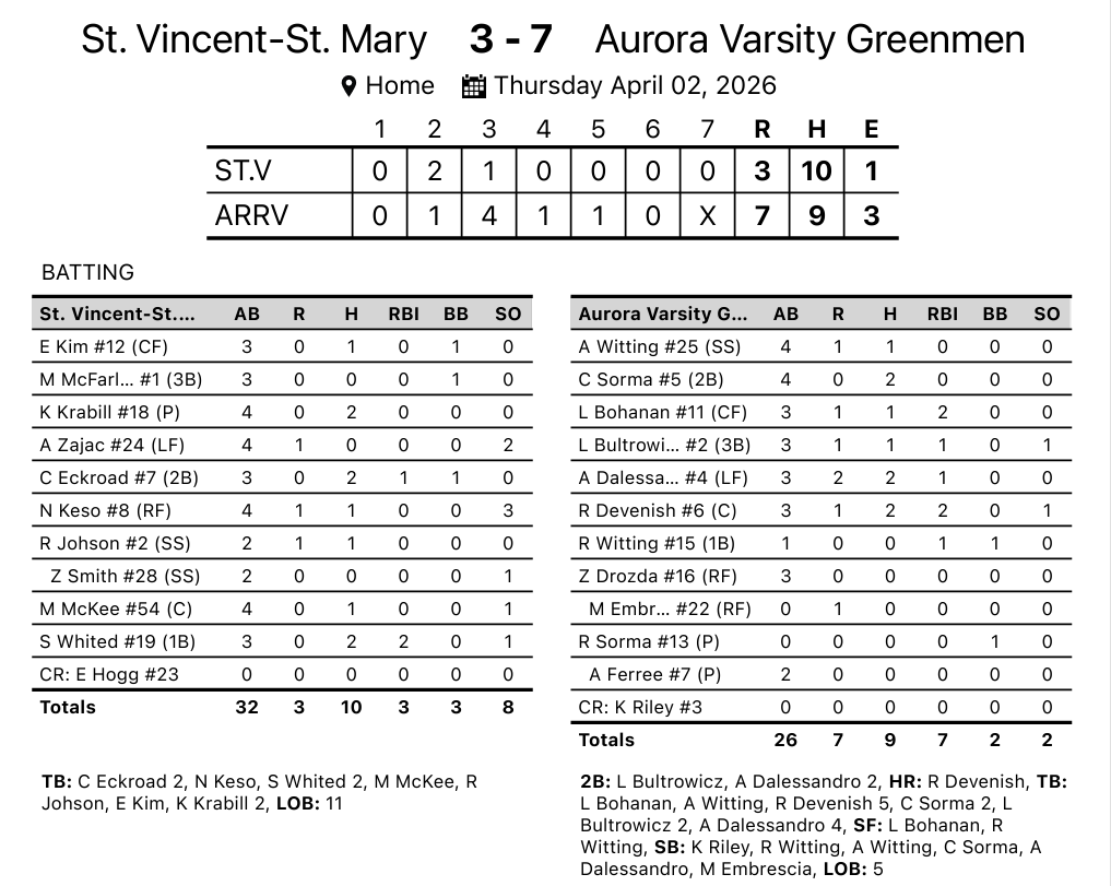 AURORA, OH- After a trip to Orlando to open the first week of the season, the Aurora Greenmen were back home to host St. Vincent St. Mary in their home opener. The Greenmen were off to a 4-1 start to the season and were looking to keep it rolling. They would use a big 4-run 3rd inning to take down the Fighting Irish 7-3.