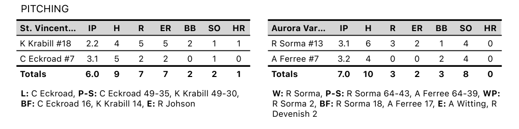 The Greenmen would finish off their scoring in the 5th. Dallesandro led off with her 2nd double of the game. After stealing 3rd base she would score on a sacrifice fly to right by Reese Witting to put Aurora up 7-3 after five.